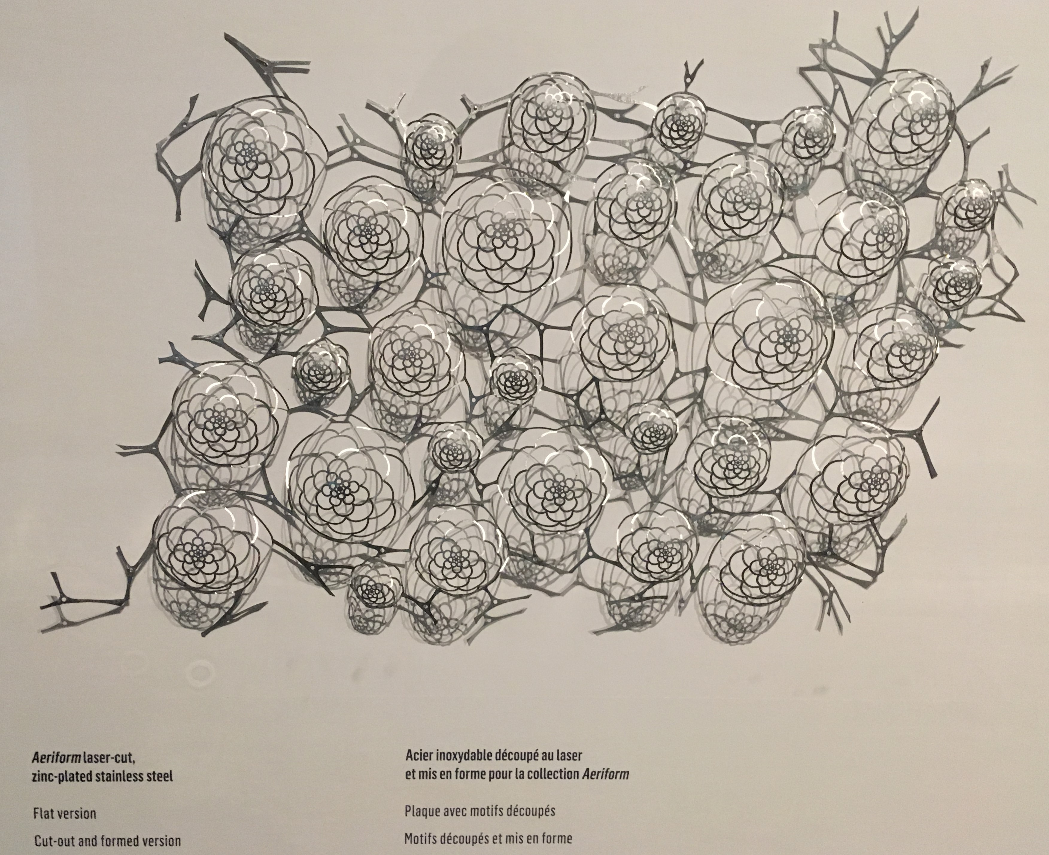 La pièce est constituée de 300 dômes en acier inoxydable travaillés comme de la dentelle. Il a fallu 62 heures de coupe au laser pour la créer.