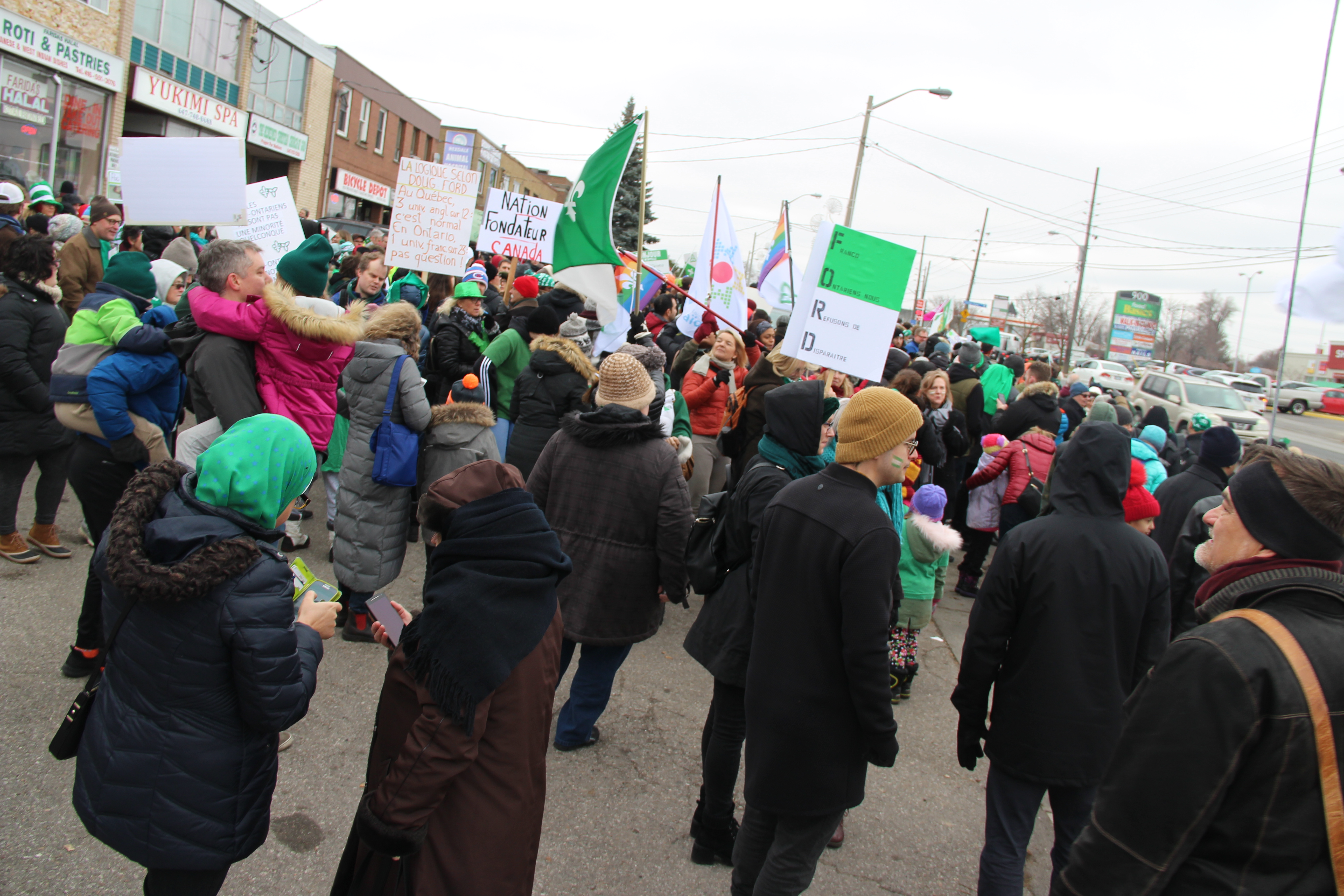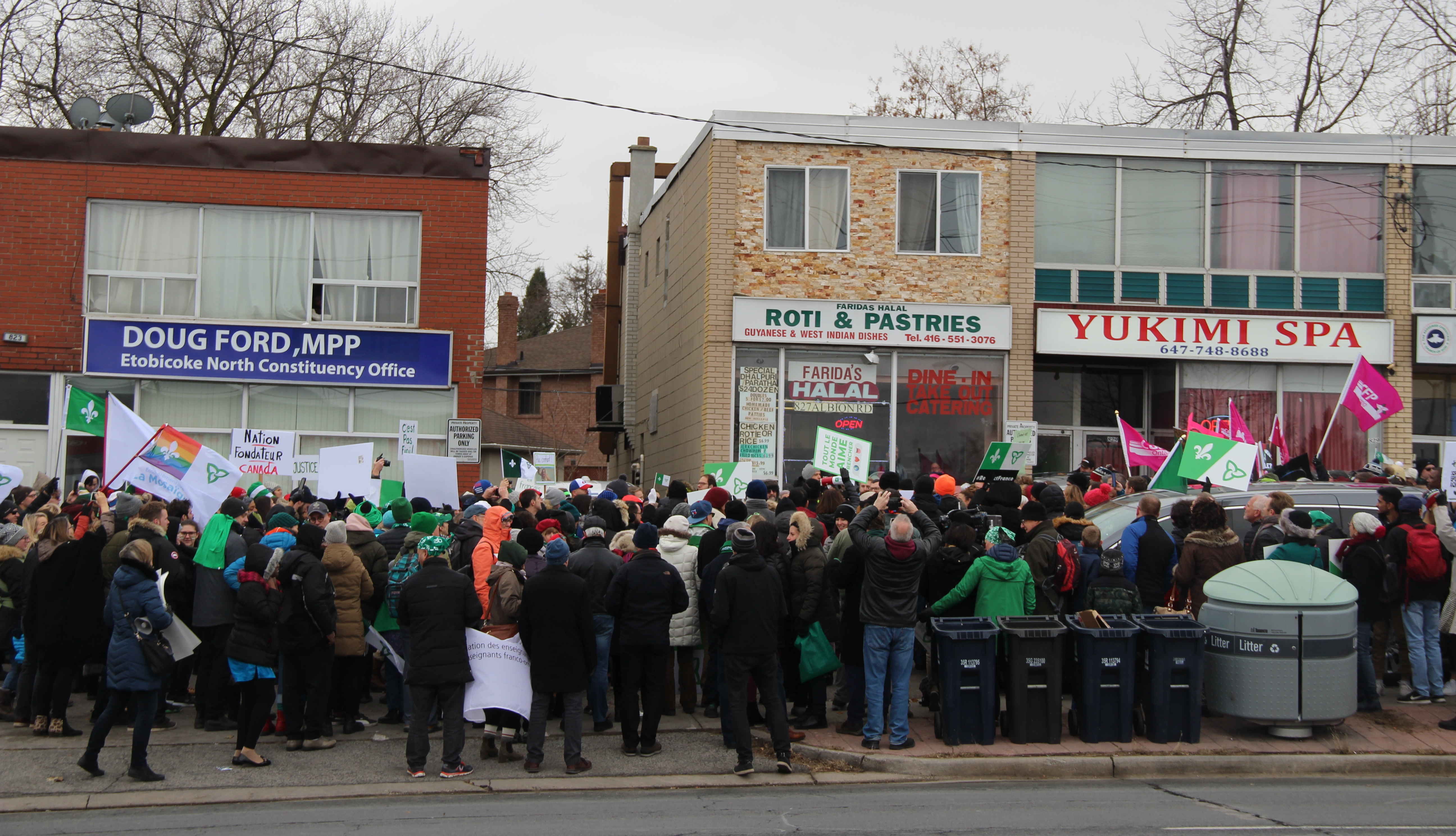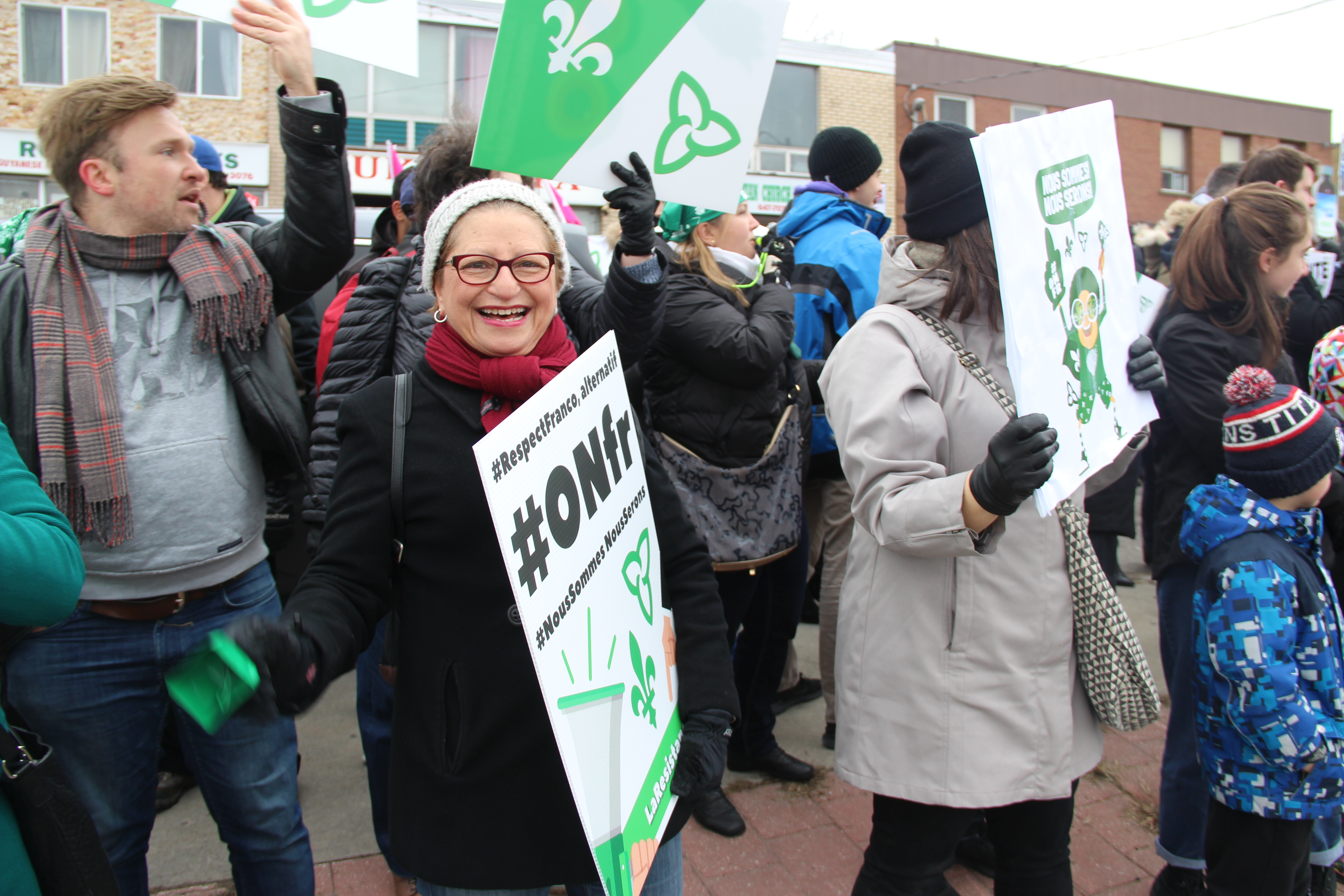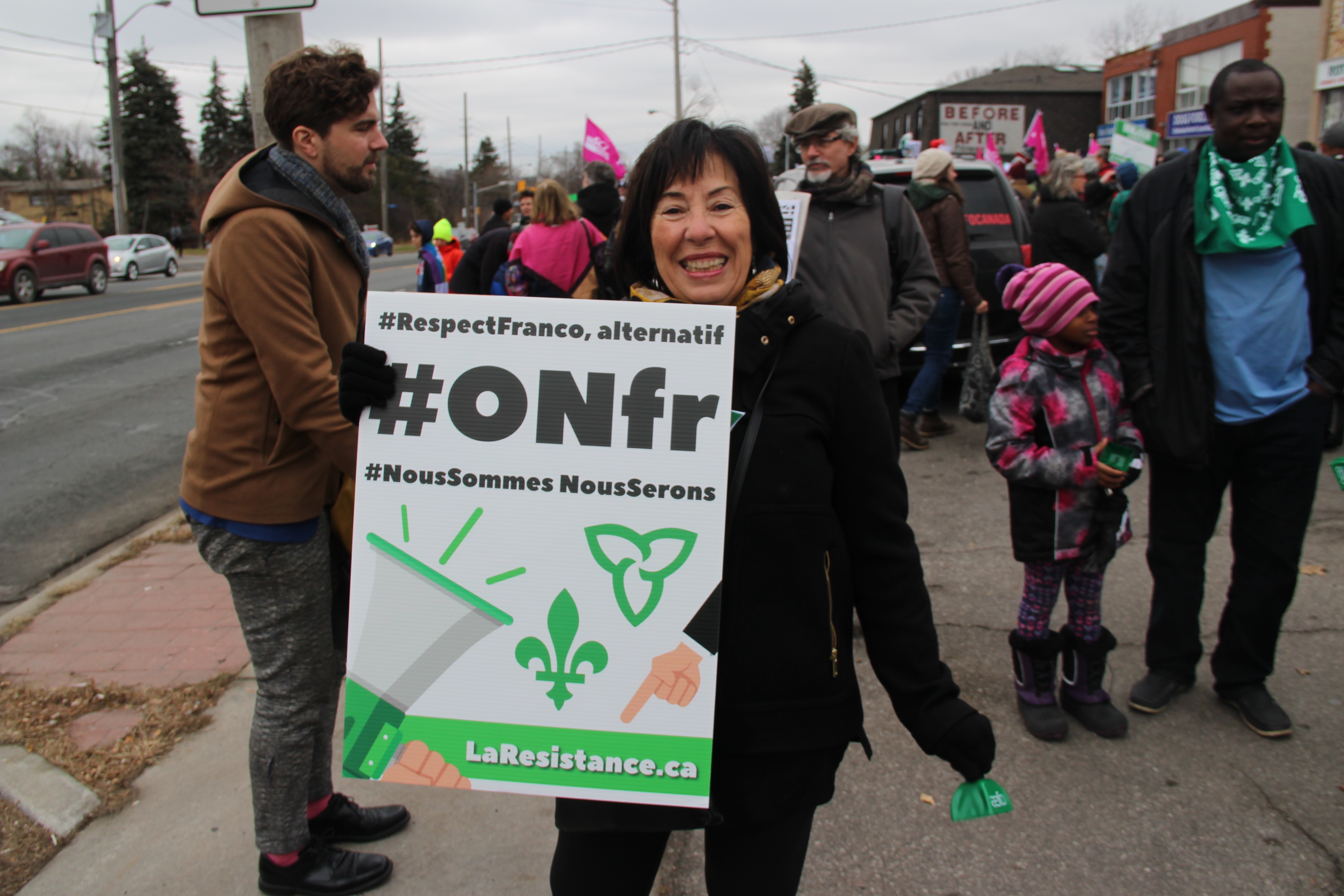 Agitant des drapeaux franco-ontariens, portant des pancartes exprimant la colère ou la dérision, chantant Notre Place et scandant «Nous sommes, nous serons», la foule était massée le long d’Albion Road, à quelques pas du bureau fermé de Doug Ford, voisin de divers petits commerces, suscitant pendant trois heures les klaxons approbateurs de nombreux automobilistes.