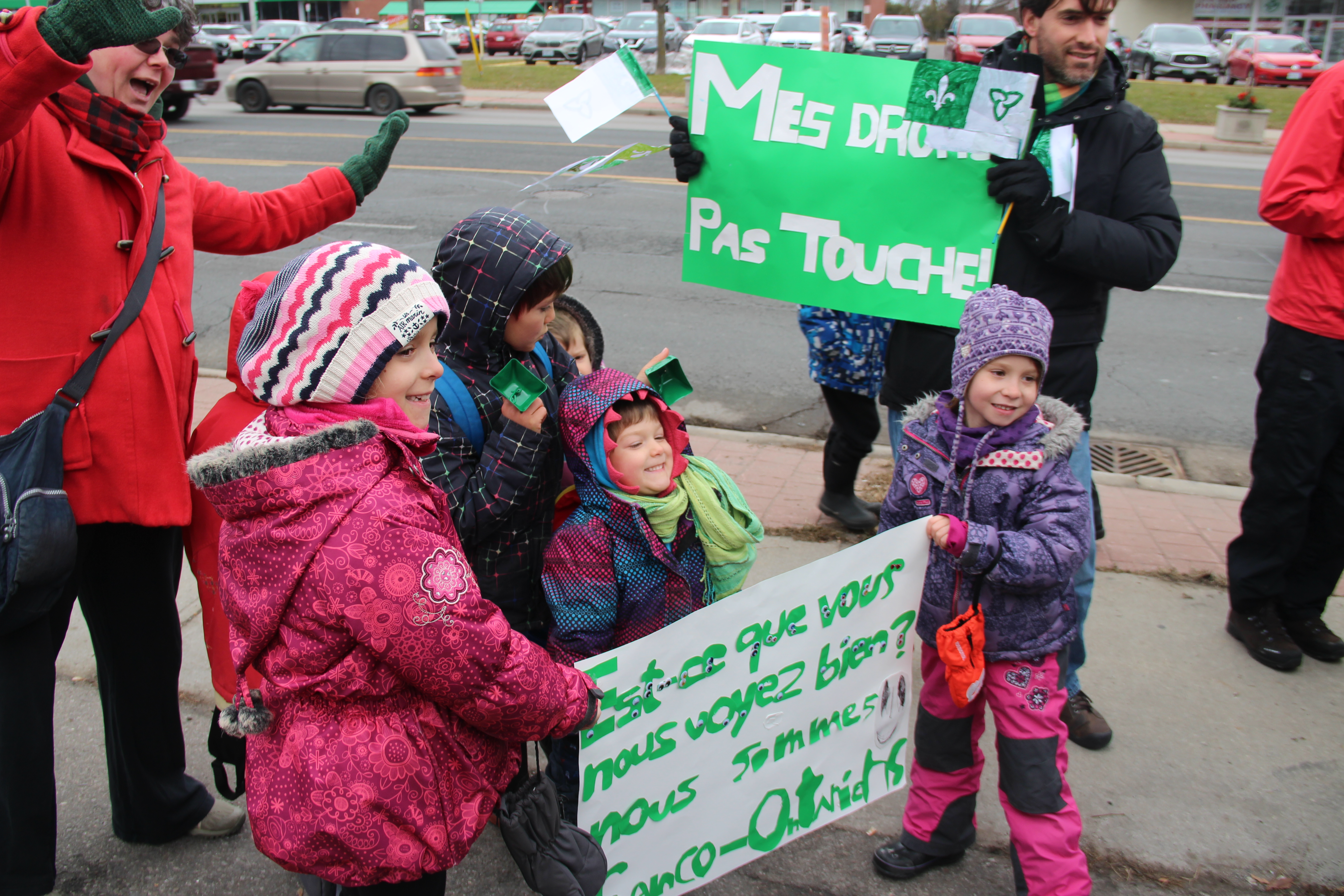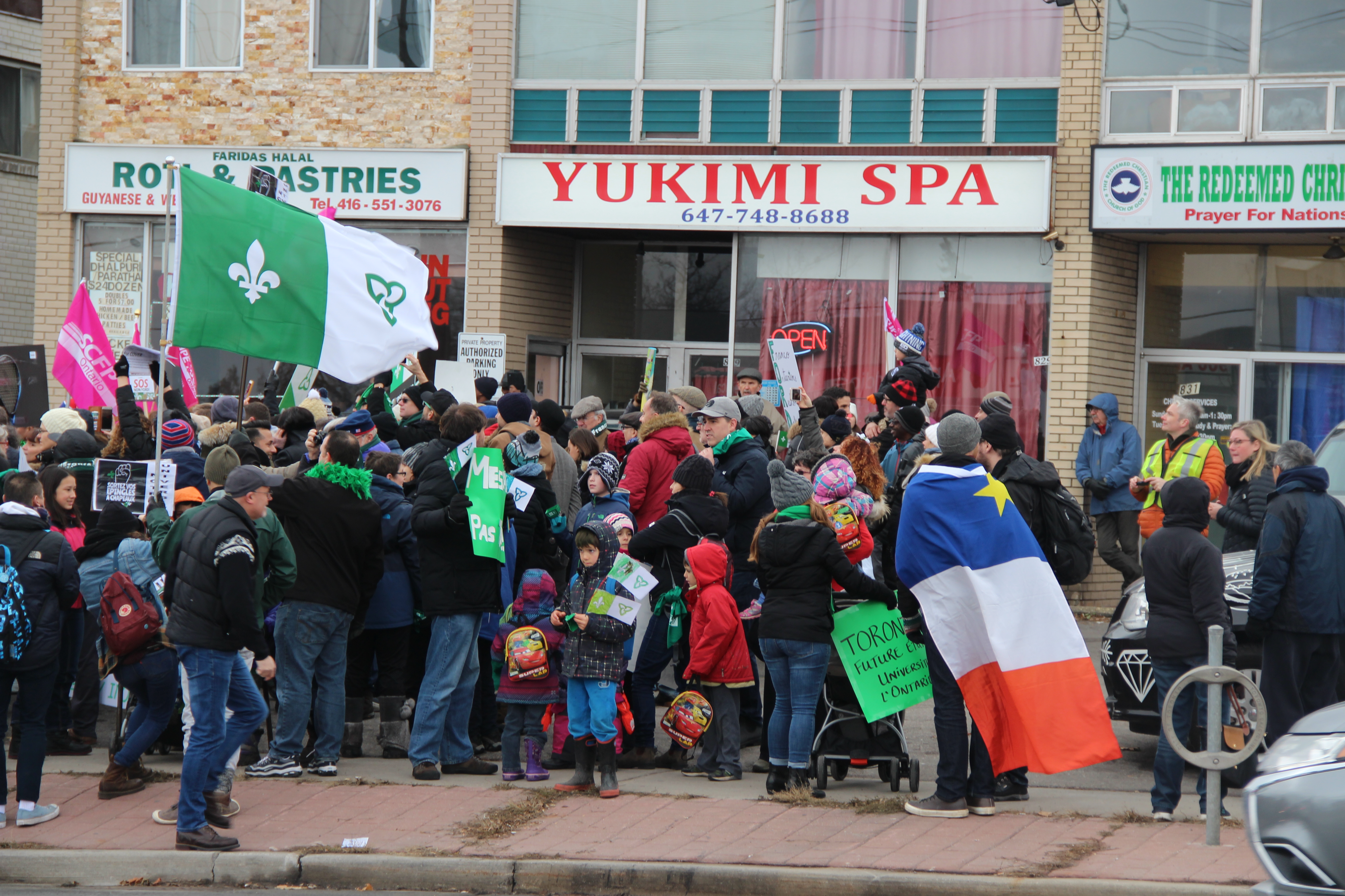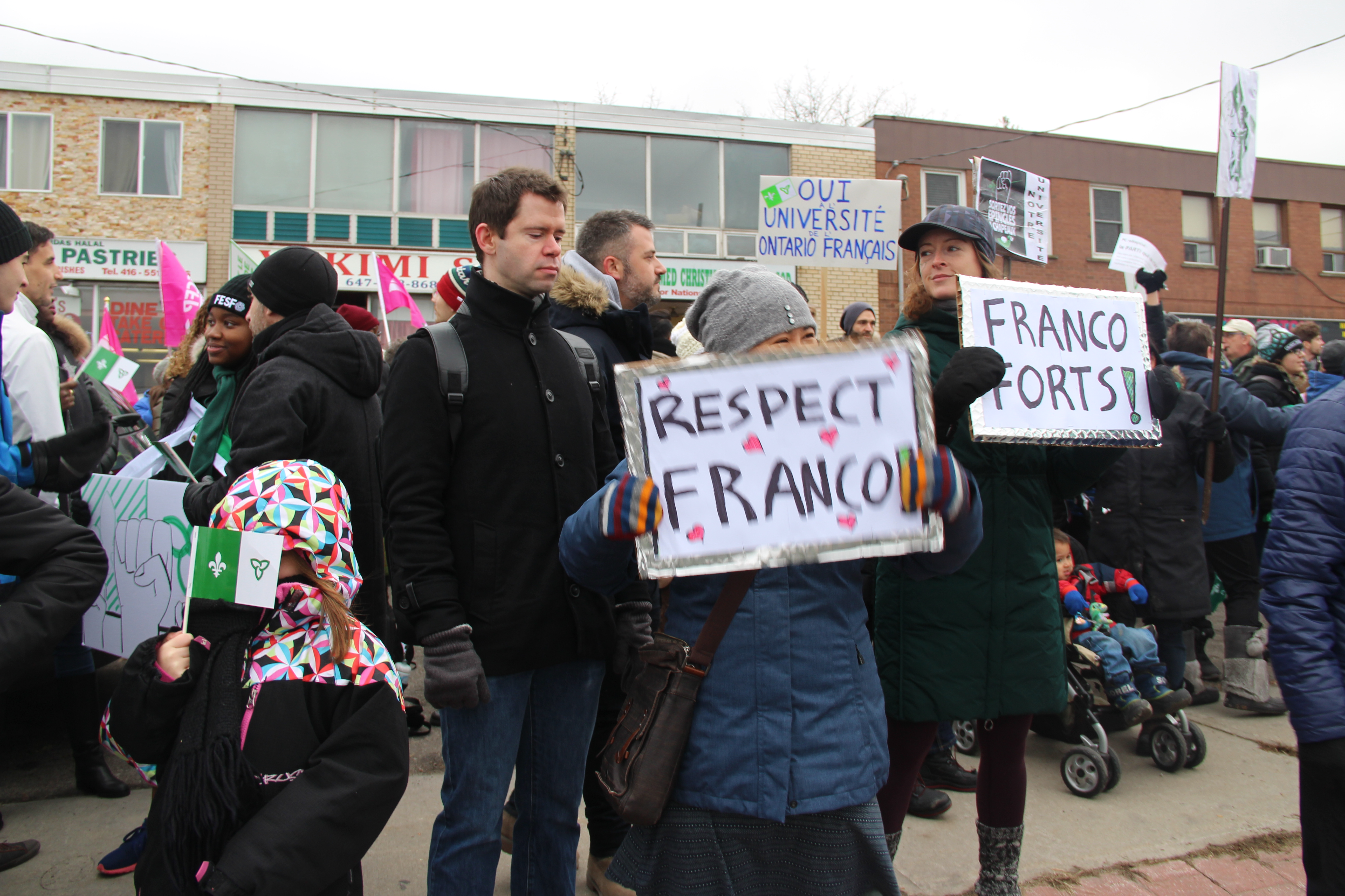 Agitant des drapeaux franco-ontariens, portant des pancartes exprimant la colère ou la dérision, chantant Notre Place et scandant «Nous sommes, nous serons», la foule était massée le long d’Albion Road, à quelques pas du bureau fermé de Doug Ford, voisin de divers petits commerces, suscitant pendant trois heures les klaxons approbateurs de nombreux automobilistes.
