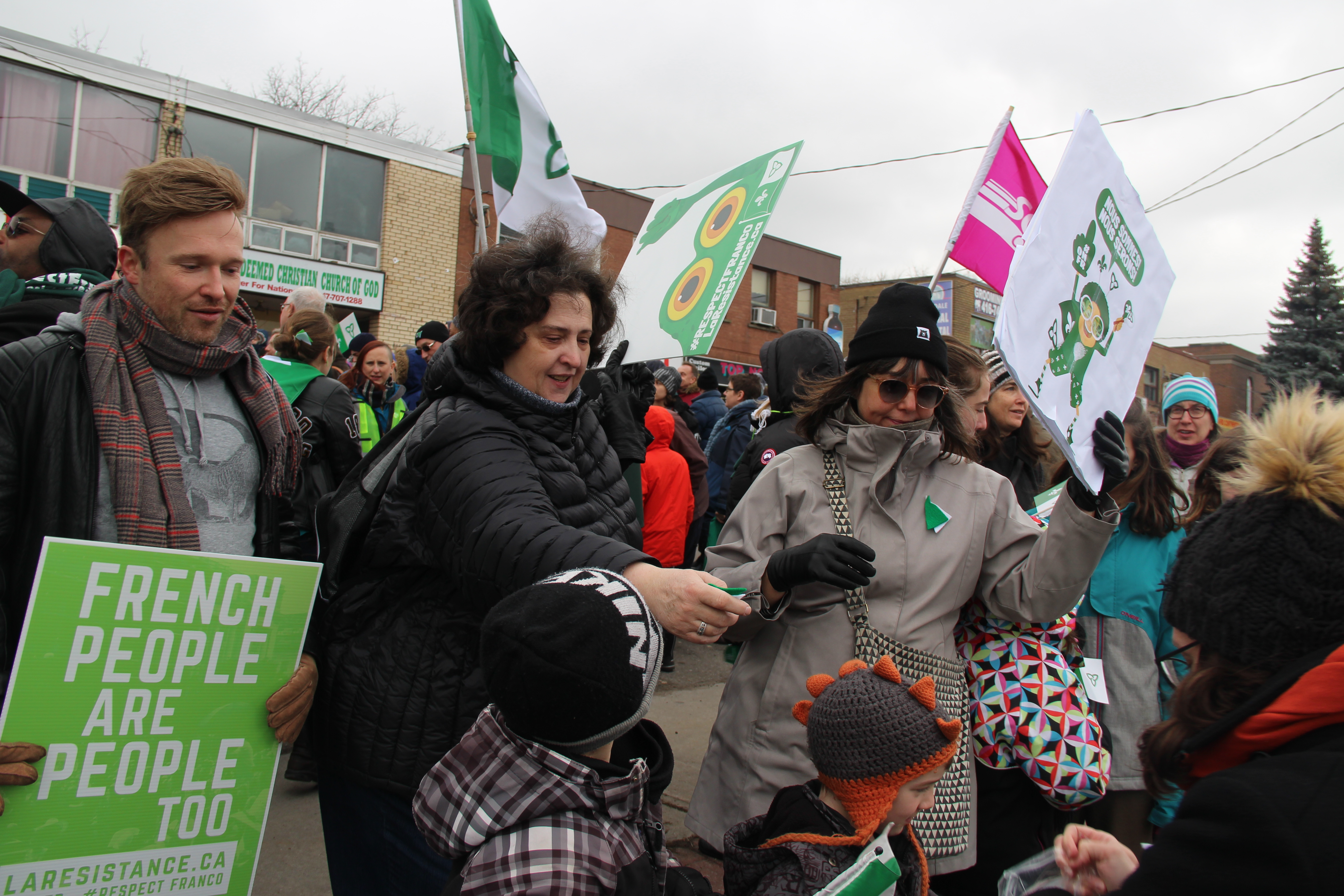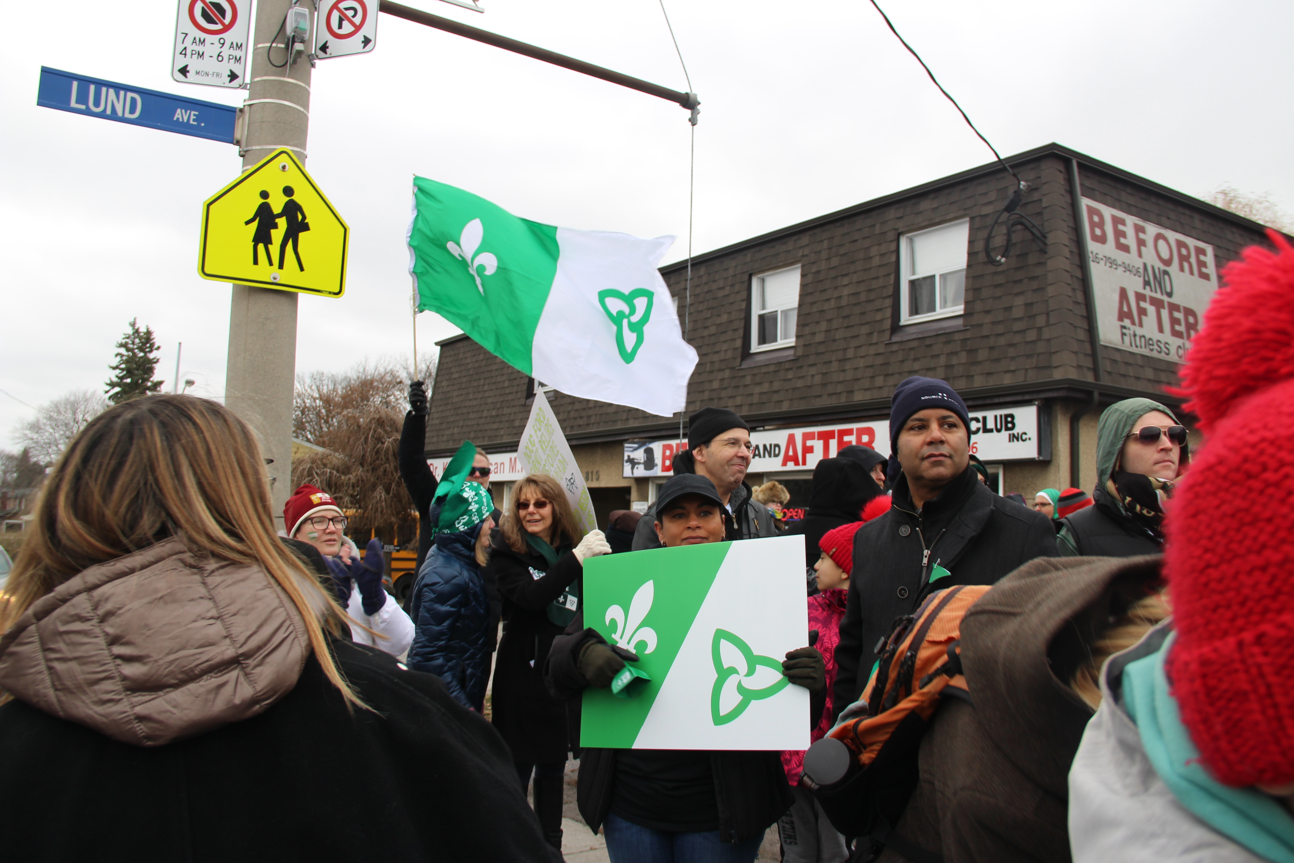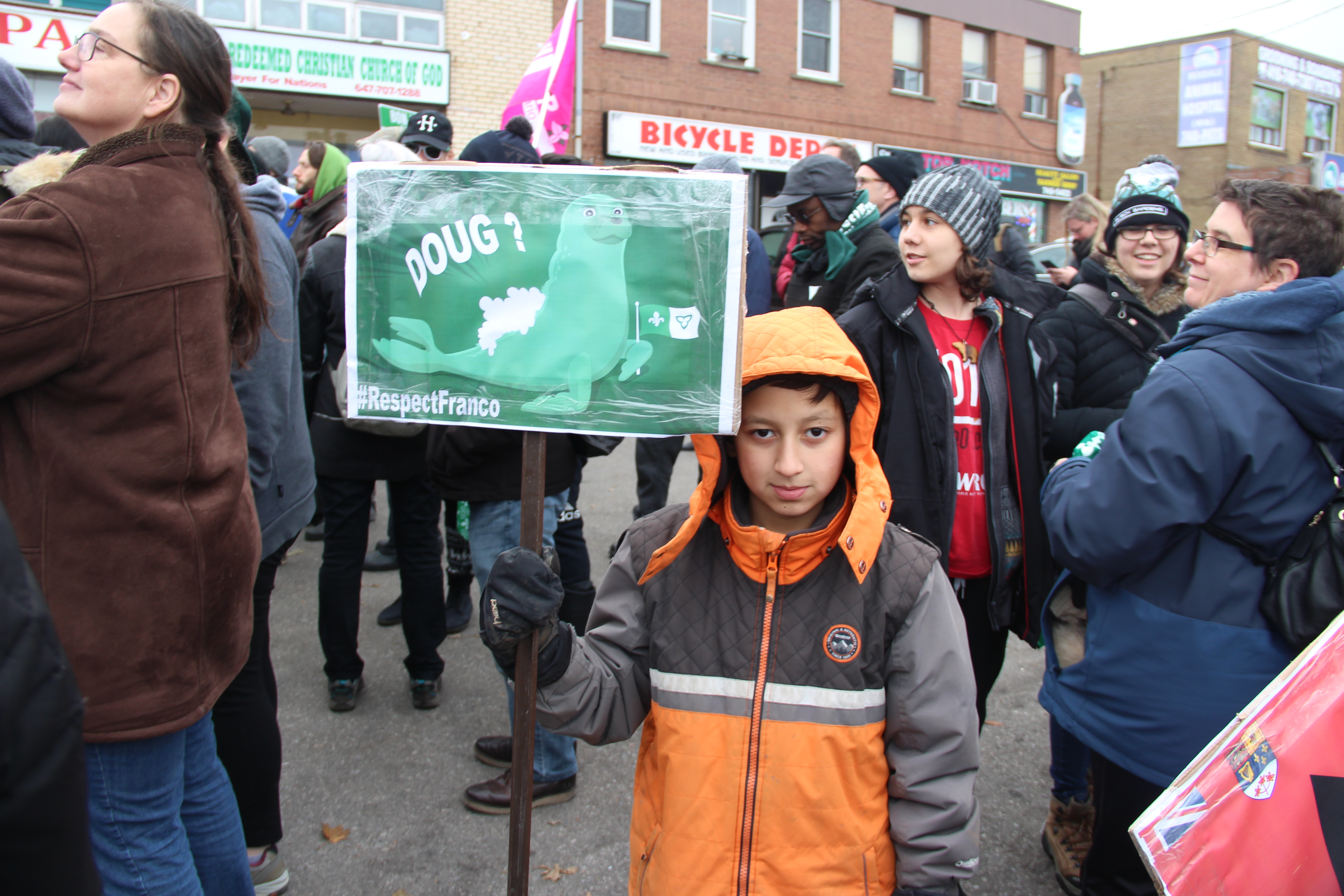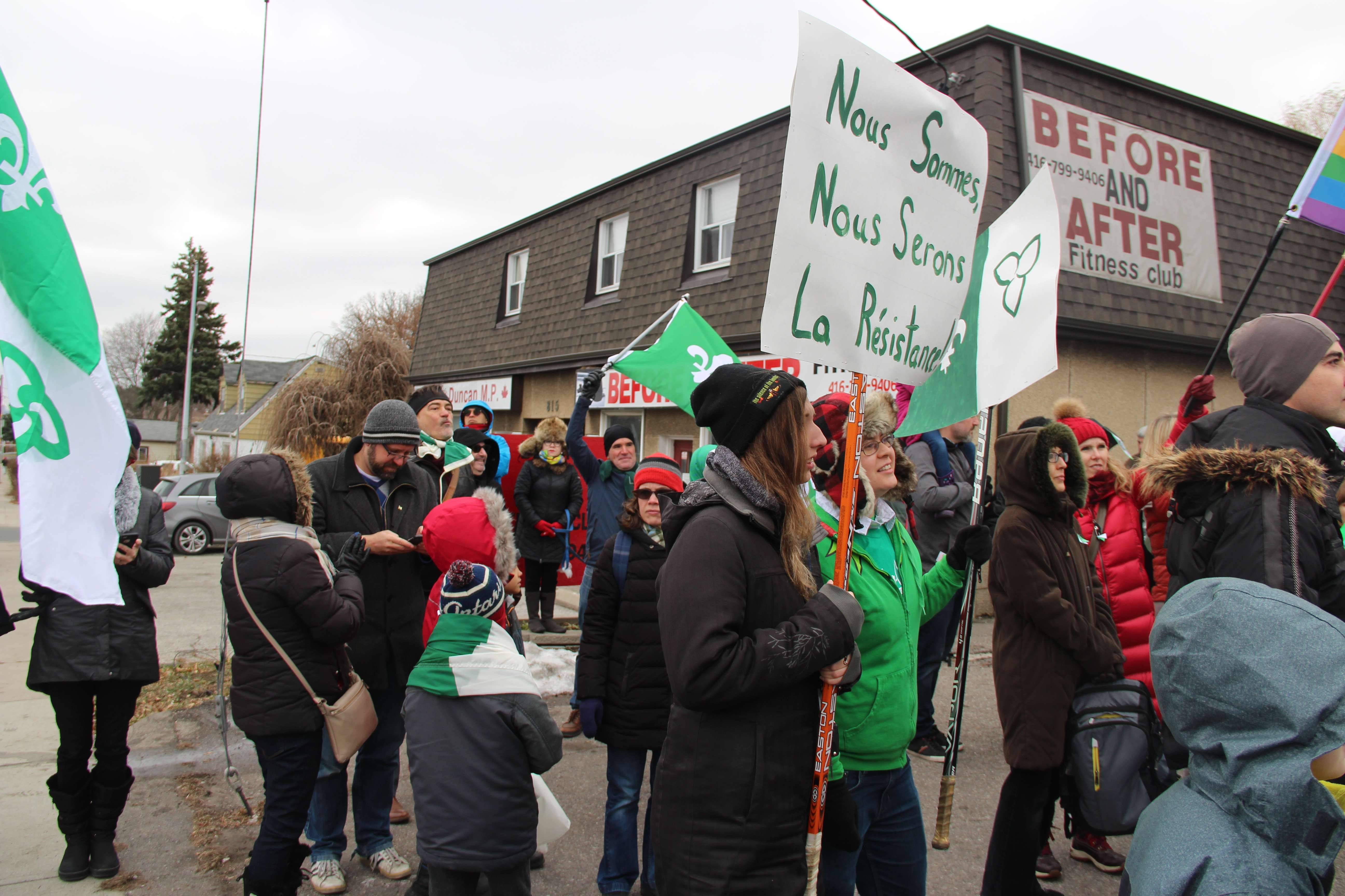 Agitant des drapeaux franco-ontariens, portant des pancartes exprimant la colère ou la dérision, chantant Notre Place et scandant «Nous sommes, nous serons», la foule était massée le long d’Albion Road, à quelques pas du bureau fermé de Doug Ford, voisin de divers petits commerces, suscitant pendant trois heures les klaxons approbateurs de nombreux automobilistes.
