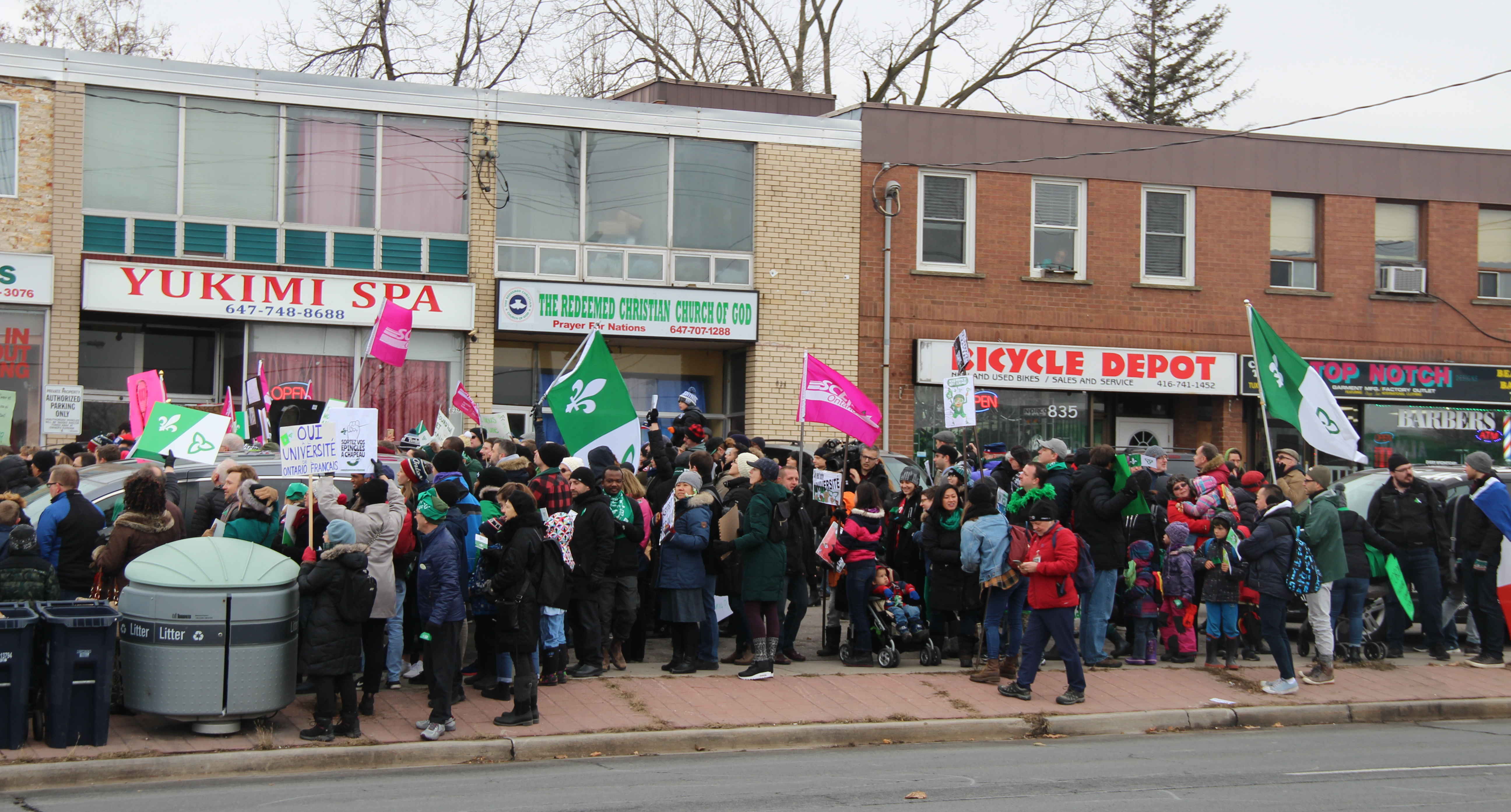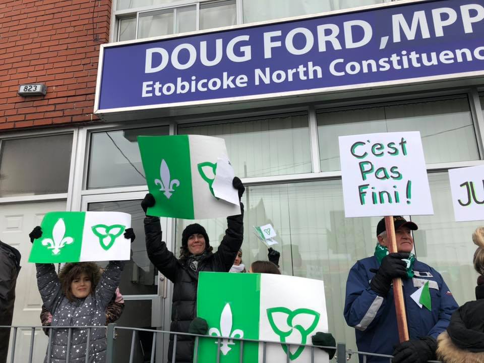 Près de 500 personnes ont manifesté, samedi après-midi, devant le bureau du député d’Etobicoke Nord, le premier ministre Doug Ford, pour réclamer le maintien du Commissariat aux services en français et de l’Université de l’Ontario français, éliminés dans la mise à jour économique et financière du gouvernement conservateur le 15 novembre.