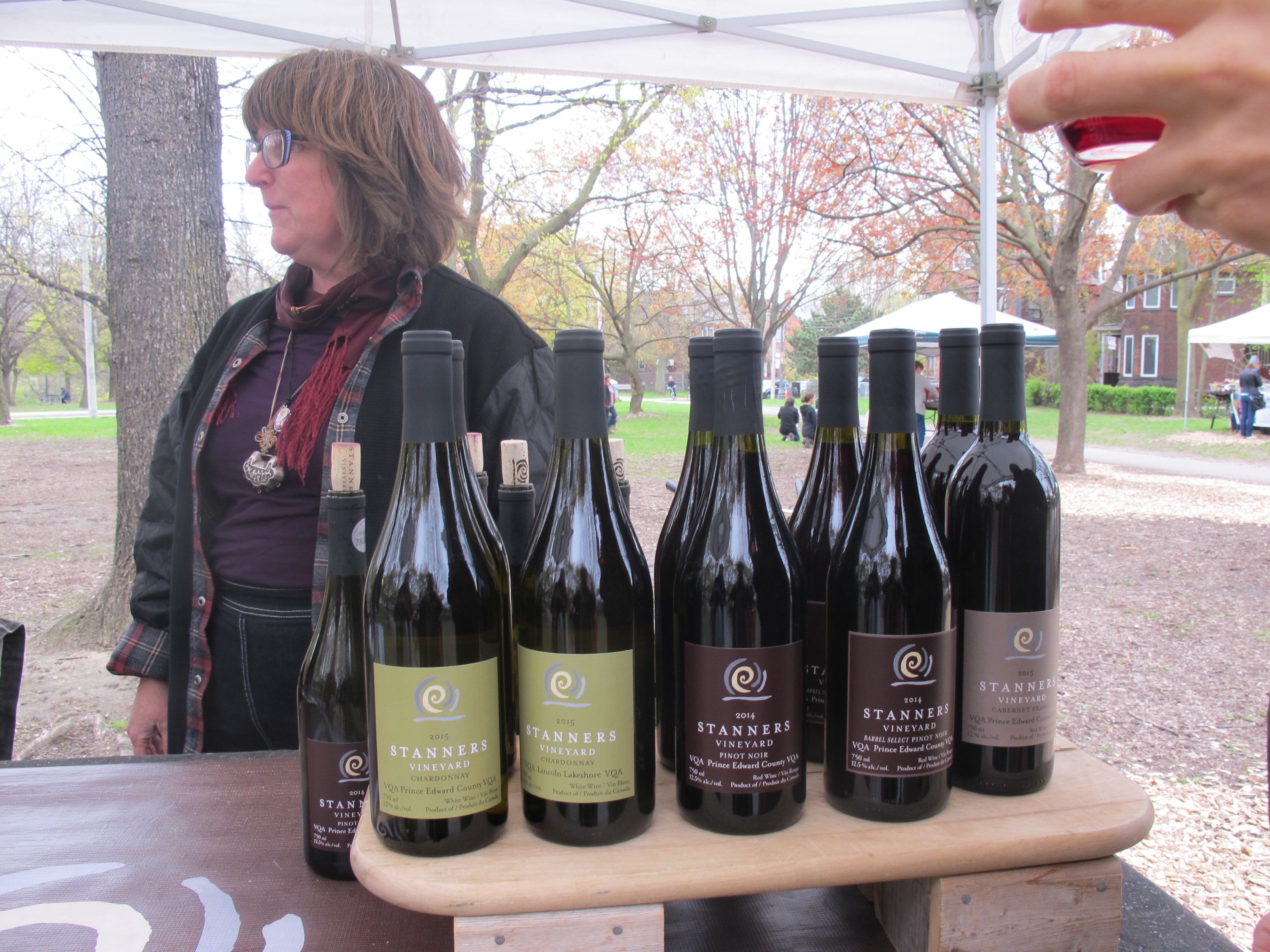 Mme Stanners vient toutes les cinq semaines au marché de Trinity-Bellwoods vendre son vin, le Stanners Vineyard, provenant des vignobles du comté de Prince Edward. Dégustation à la clef, la vigneronne conserve une belle histoire et une culture de la récolte, offrant ainsi un moment d’histoire du vin.