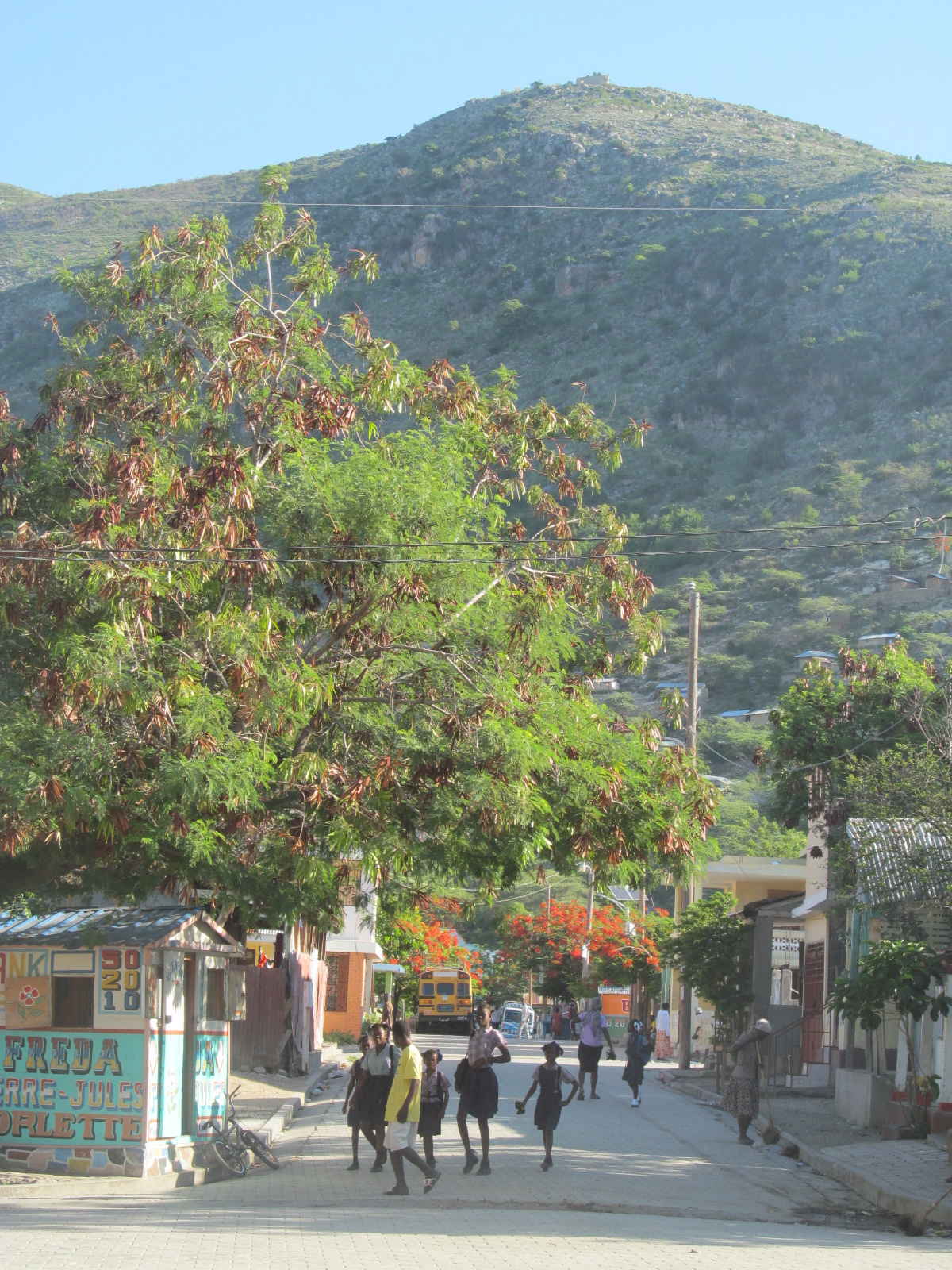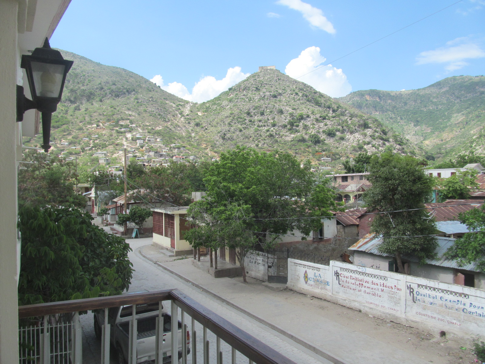 Nous arrivons à Marchand Dessalines au crépuscule du soir. La luminosité donne un effet magique aux fortifications de la ville juchées sur les montagnes encerclant Dessalines.