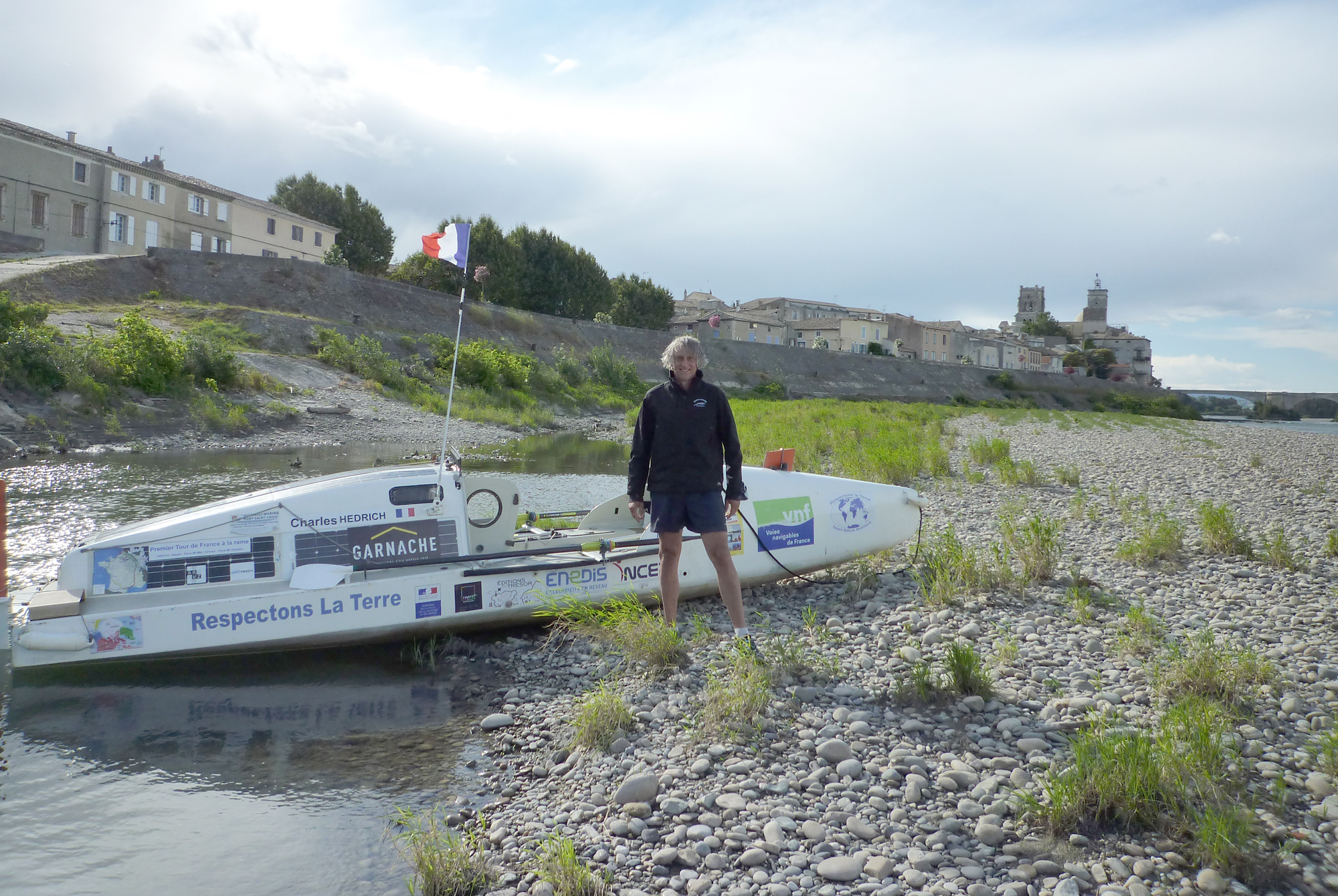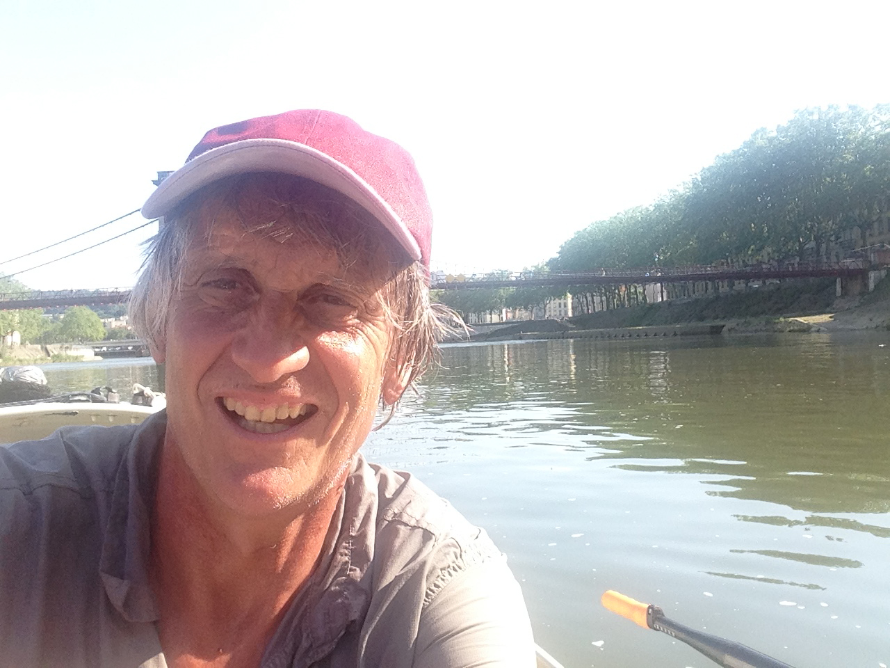 Fin juin il était sur la Petite Saône. Il a depuis traversé la Saône et le Rhône. D’ailleurs ce ne fut pas de tout repos: n’ayant pas eu l’autorisation de passer les écluses sur le Rhône, il a dû sortir son Rameur des Glaces de l’eau, lui installer les roues amovibles, le tirer parfois sur plus d’1.5 km sur des chemins spécialement aménagés pour des canots, lui enlever les roues, puis le remettre à l’eau, et ce, pour chacune des 13 écluses.