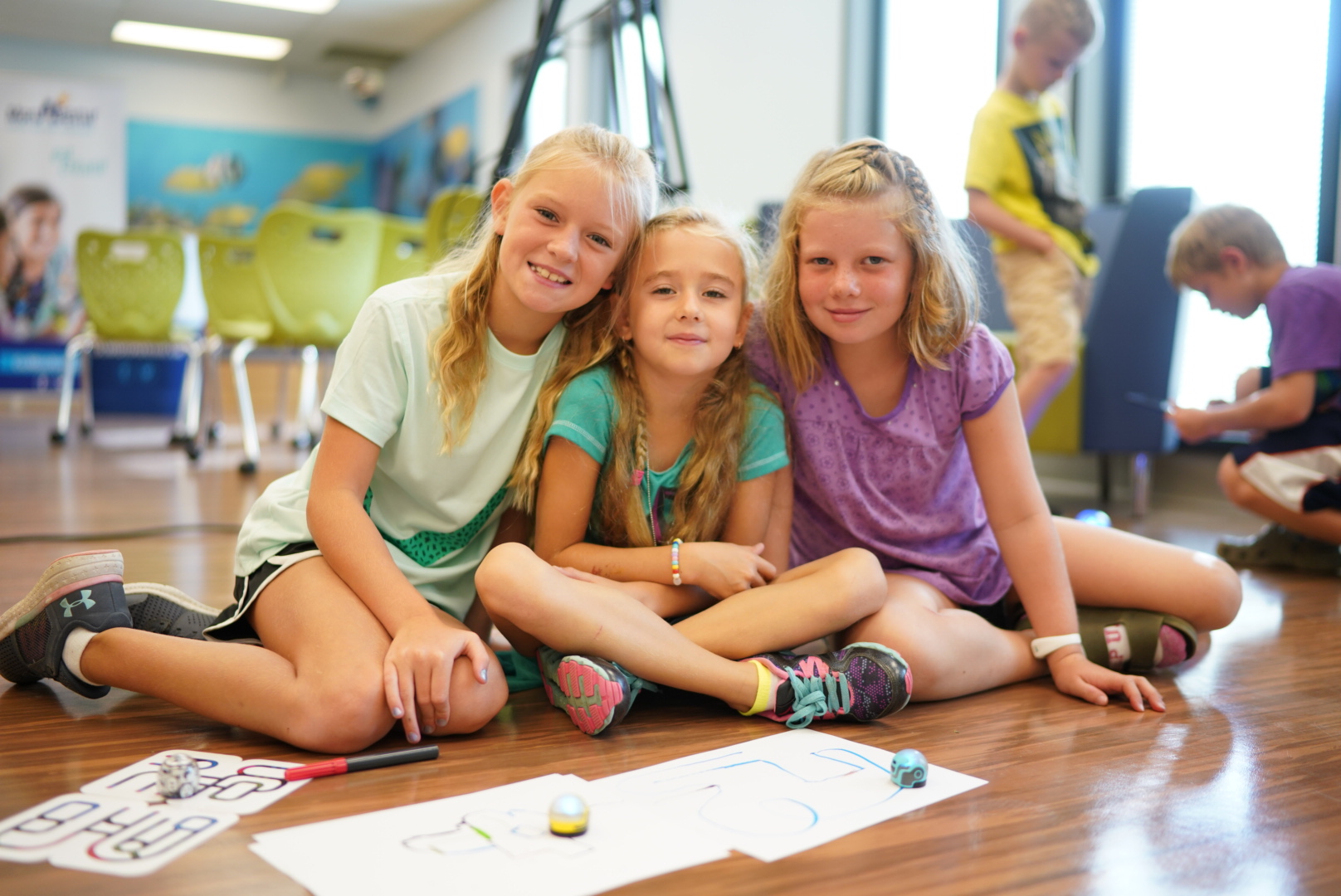 L’idée est de permettre aux élèves d’explorer et d’exposer leurs preuves d’apprentissage sur papier, tables de travail, murs, planchers en plus des ordinateurs portables Chrome Book et tableaux blancs interactifs.