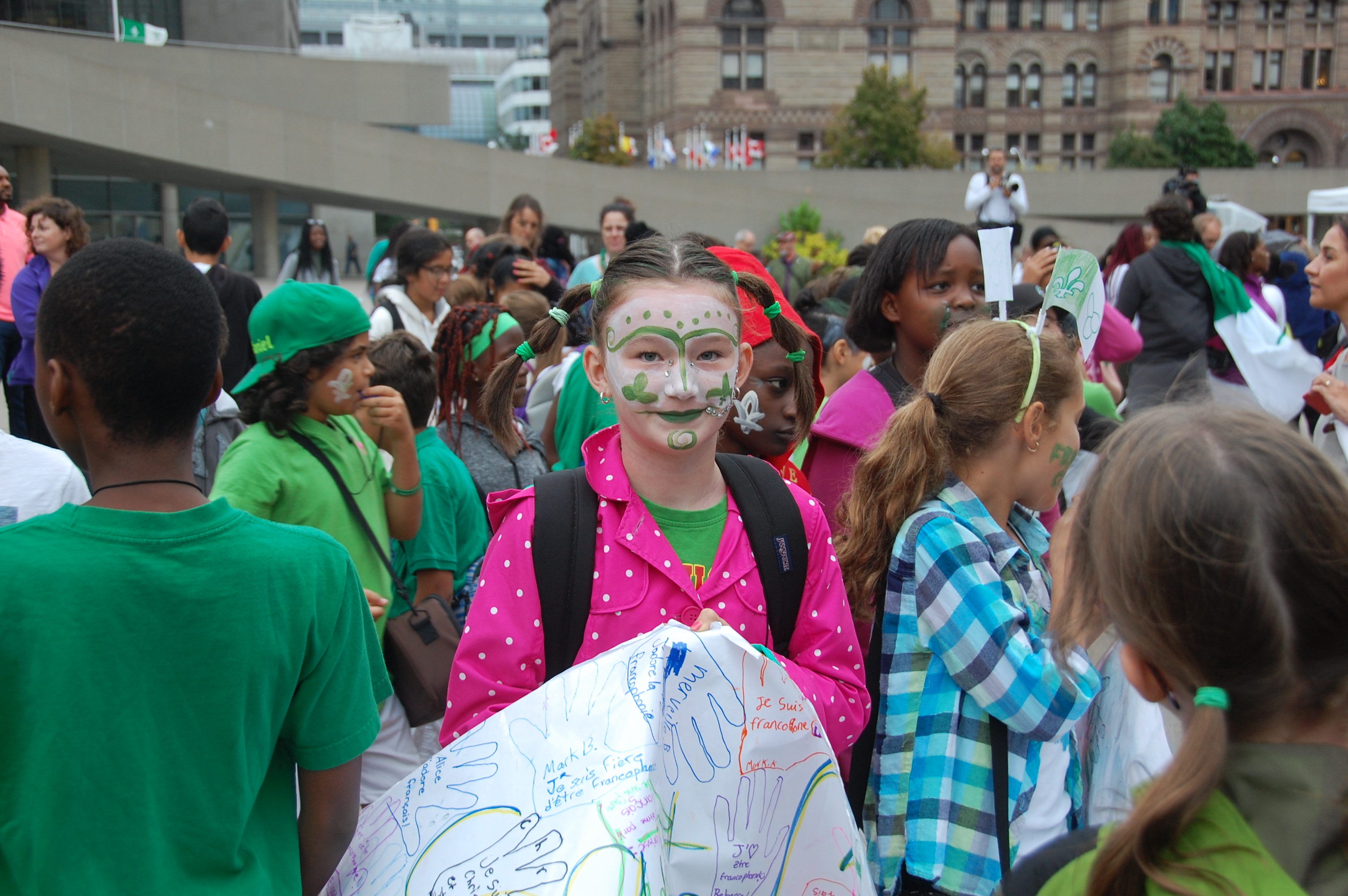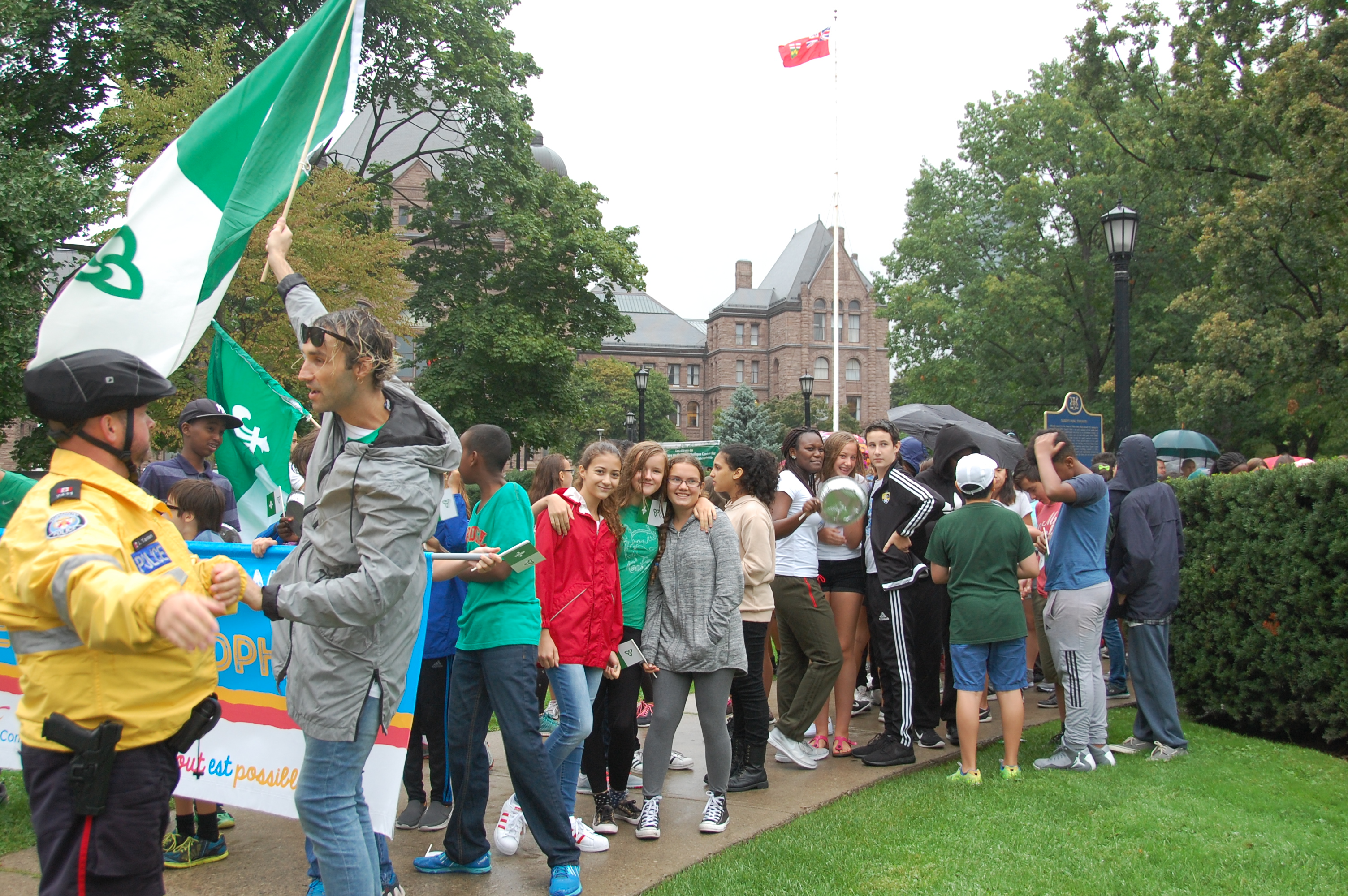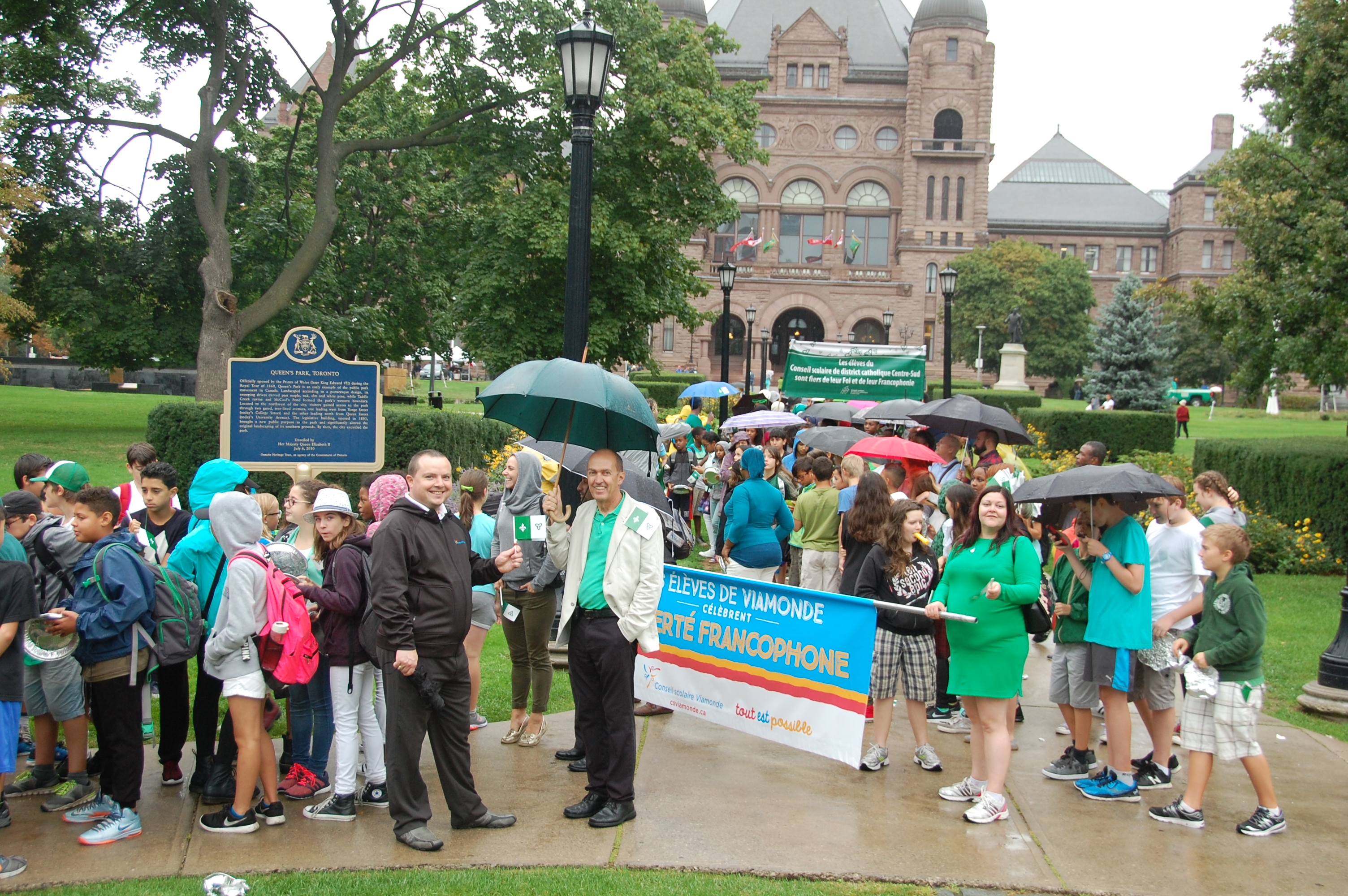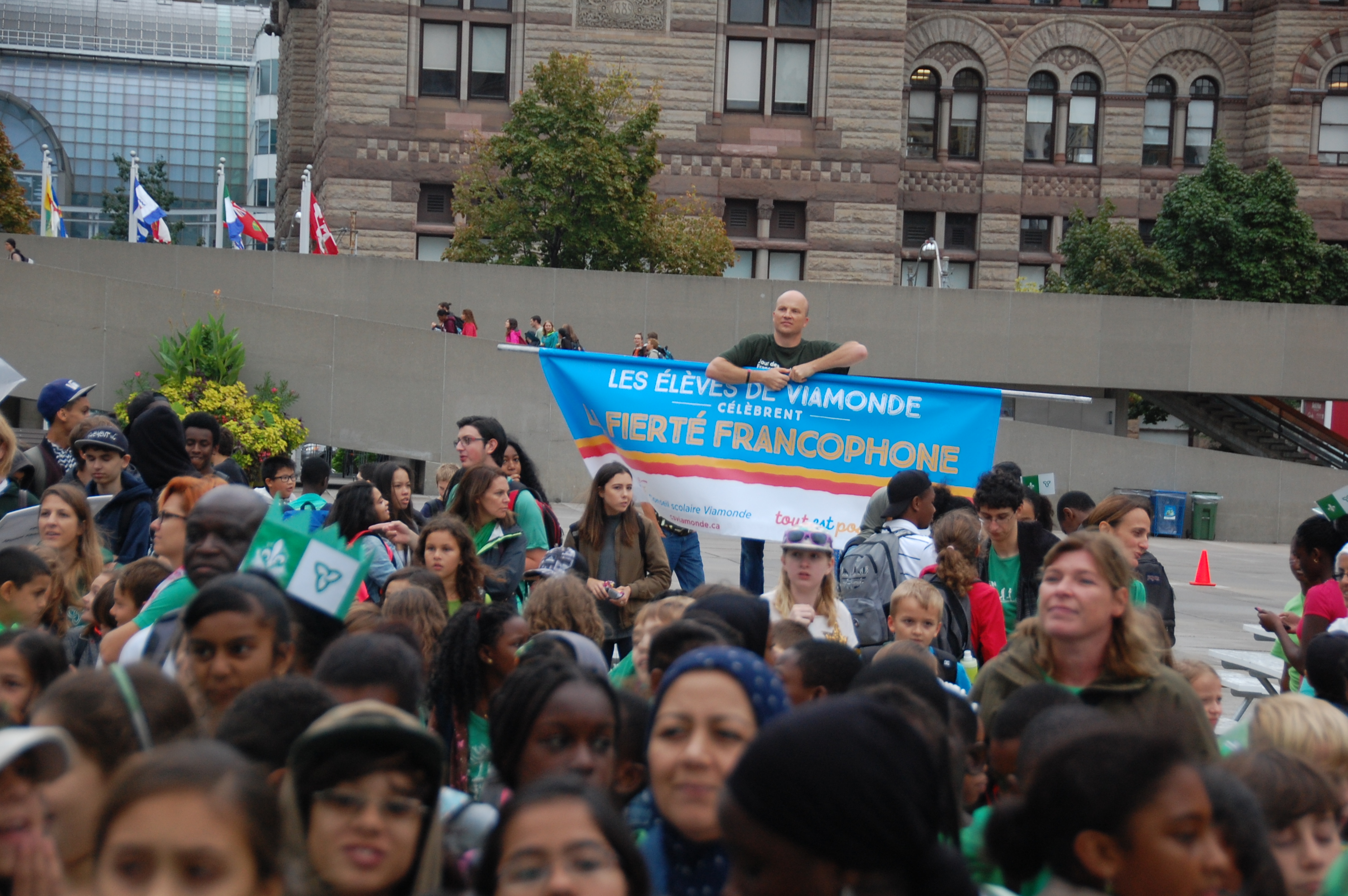 Bardés de petits et de grands drapeaux franco-ontariens, habillés et maquillés en vert et blanc, les jeunes ont crié leur fierté franco-ontarienne et applaudi les enseignants qui les accompagnaient et les dirigeants des deux conseils scolaires: le président de Viamonde Jean-François L’Heureux, élu à Toronto et parents d’élèves dans ce système, et le conseiller scolaire catholique Claude-Reno D’Aigle, également élu à Toronto et vétéran des causes francophones.
