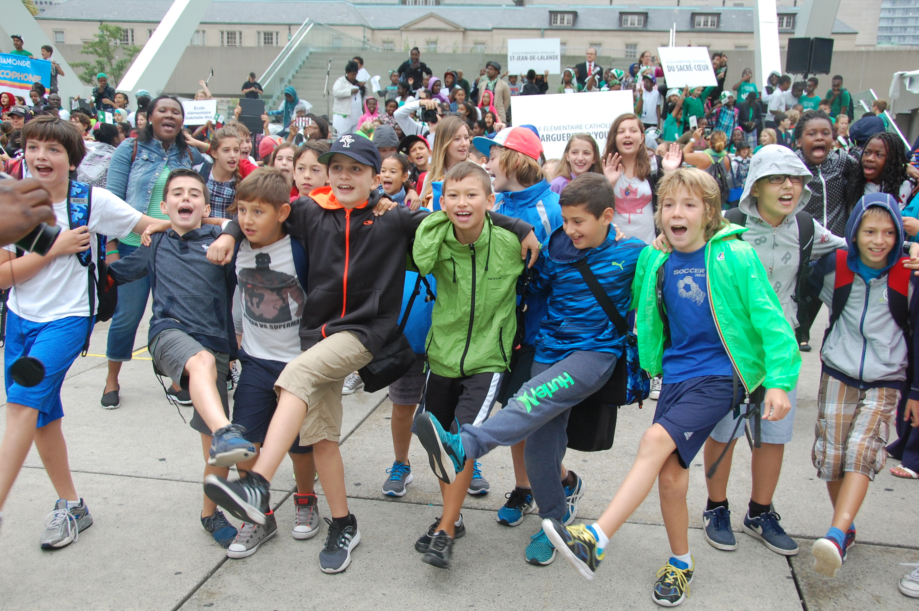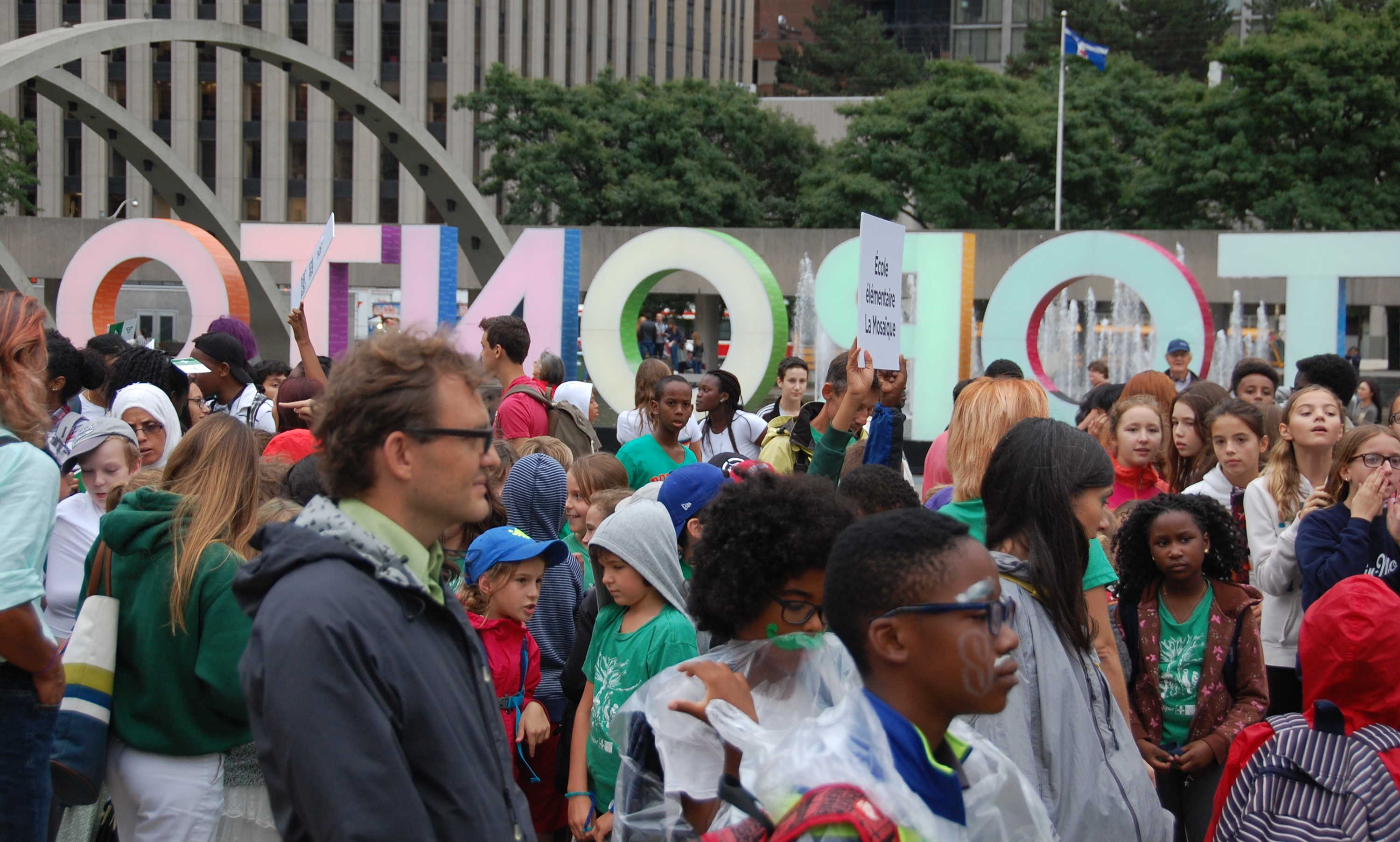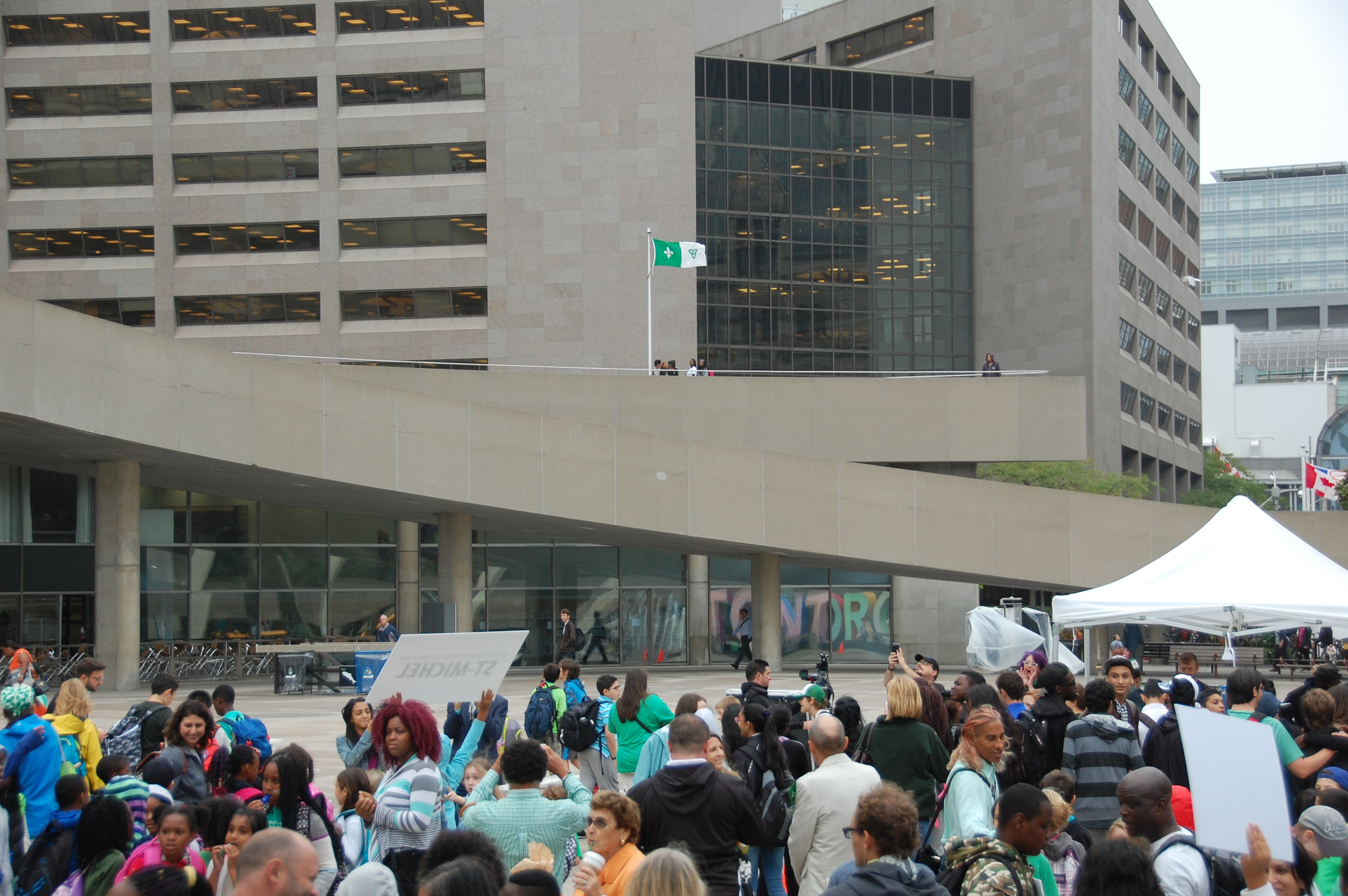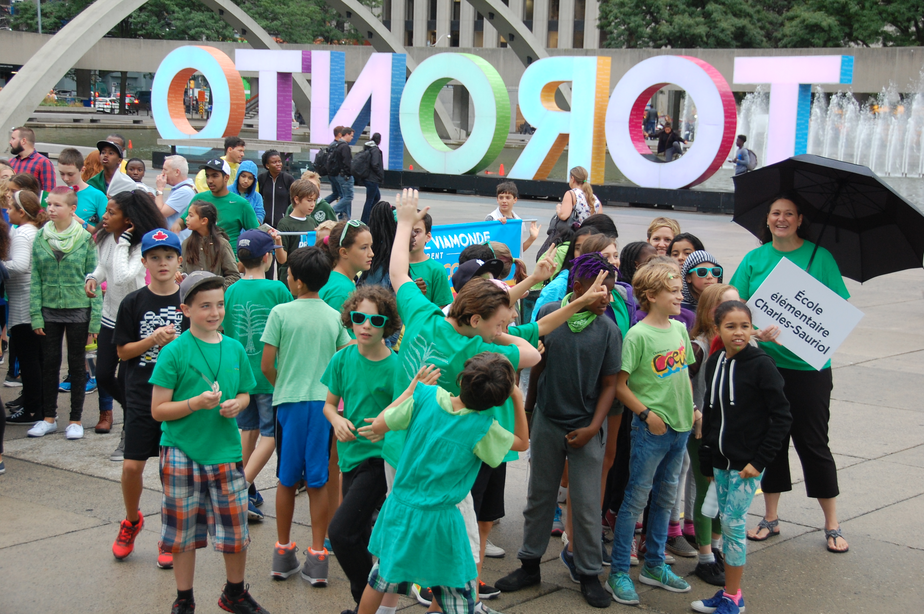 Bardés de petits et de grands drapeaux franco-ontariens, habillés et maquillés en vert et blanc, les jeunes ont crié leur fierté franco-ontarienne et applaudi les enseignants qui les accompagnaient et les dirigeants des deux conseils scolaires: le président de Viamonde Jean-François L’Heureux, élu à Toronto et parents d’élèves dans ce système, et le conseiller scolaire catholique Claude-Reno D’Aigle, également élu à Toronto et vétéran des causes francophones.