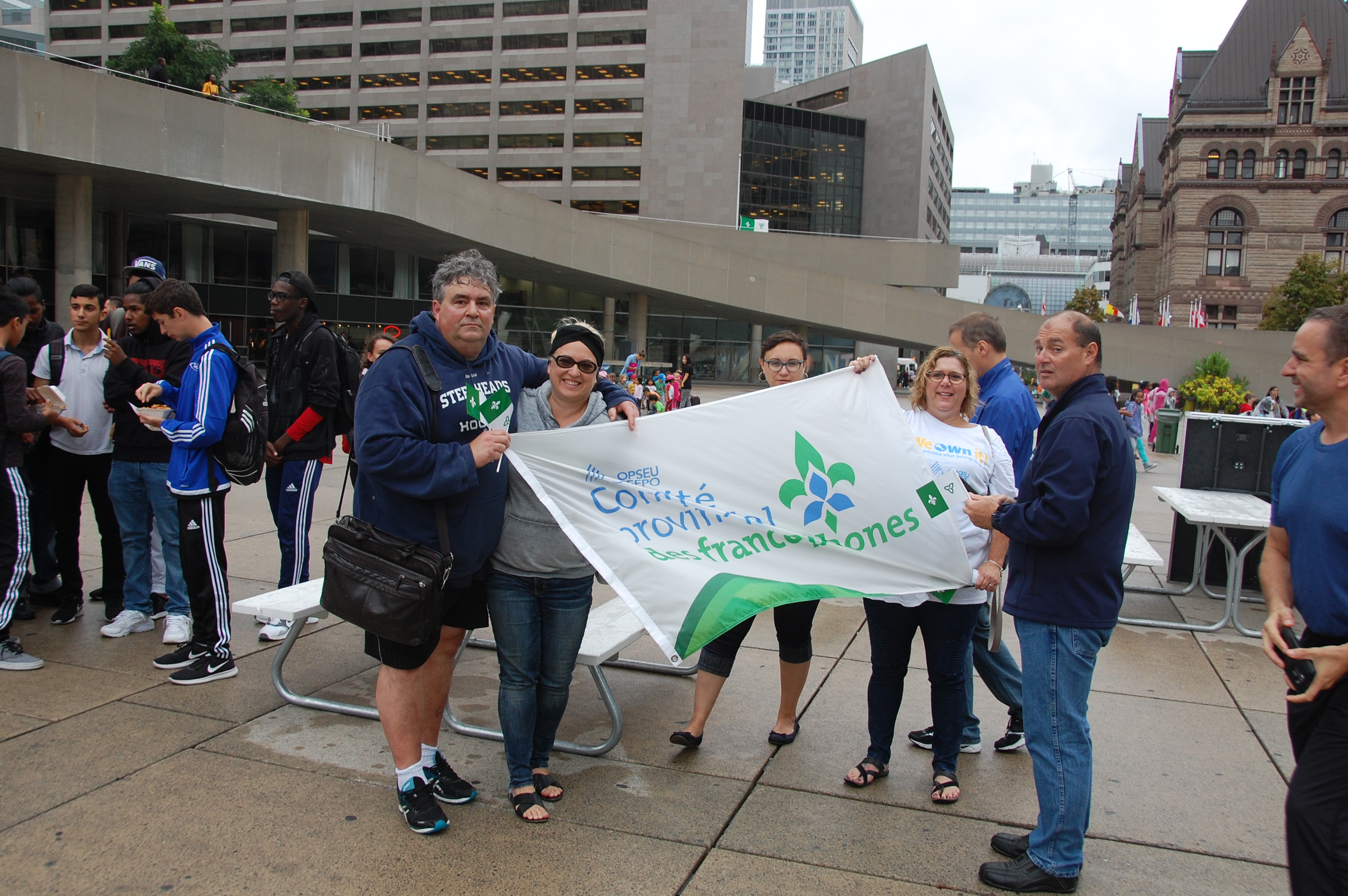 Escortés par la police, ces jeunes ont ensuite descendu l’avenue University en chantant et faisant le plus de bruit possible pour participer à la levée du drapeau sur la place Nathan Phillips, en présence du conseiller municipal Norm Kelly, qui est aussi président du Comité consultatif francophone de la Ville de Toronto.